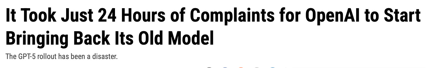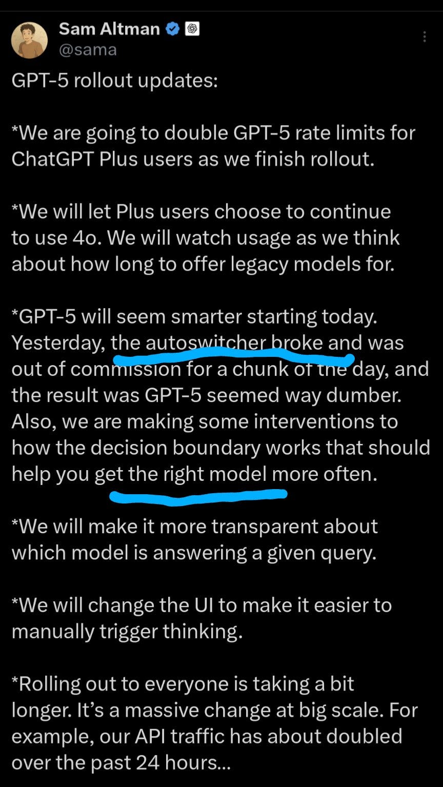 The focus on tool orchestration has also hurt its ability to generate text [source]. Since tool orchestration is an extremely difficult challenge, it’s likely that OpenAI is currently collecting data and optimizing its router. More here: