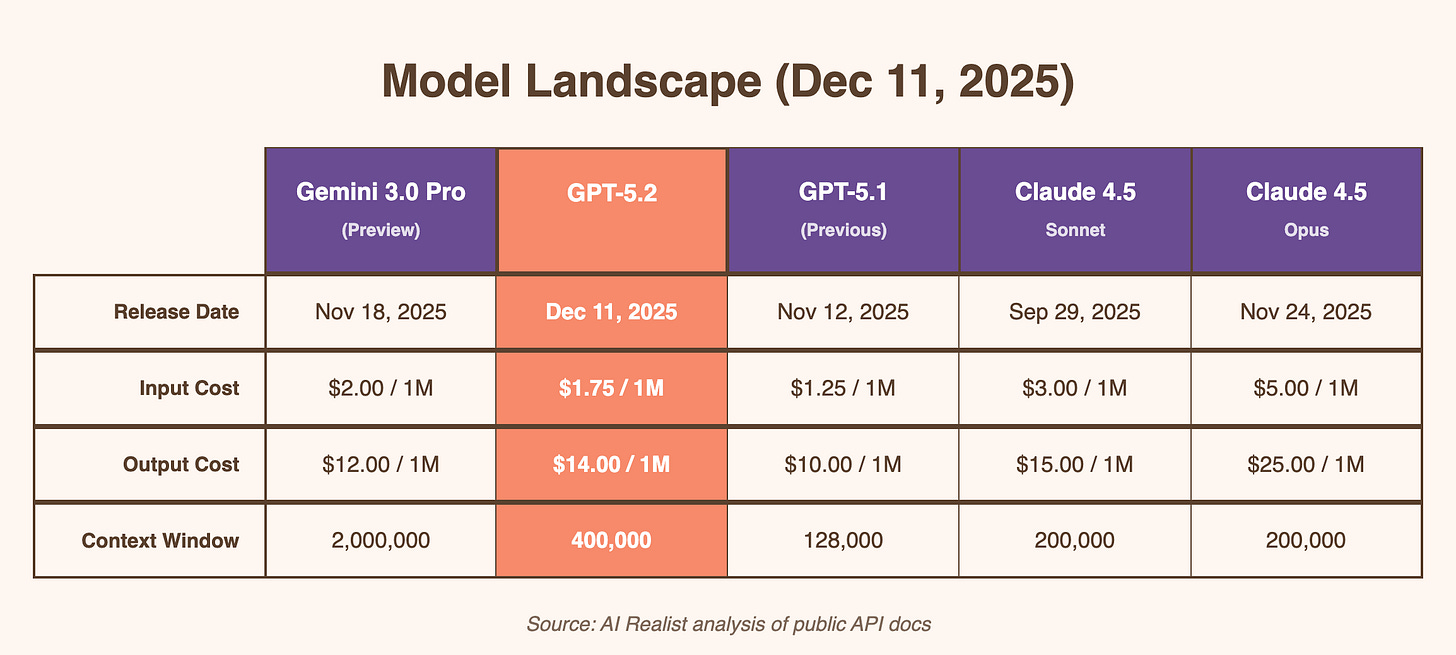 Yesterday (December 11, 2025), OpenAI dropped another model: GPT-5.2. It’s presented as their most advanced model yet, with state-of-the-art results across several import benchmarks. It totally outperforms Gemini 3.0 and Opus 4.5. Wow! What an achievement!