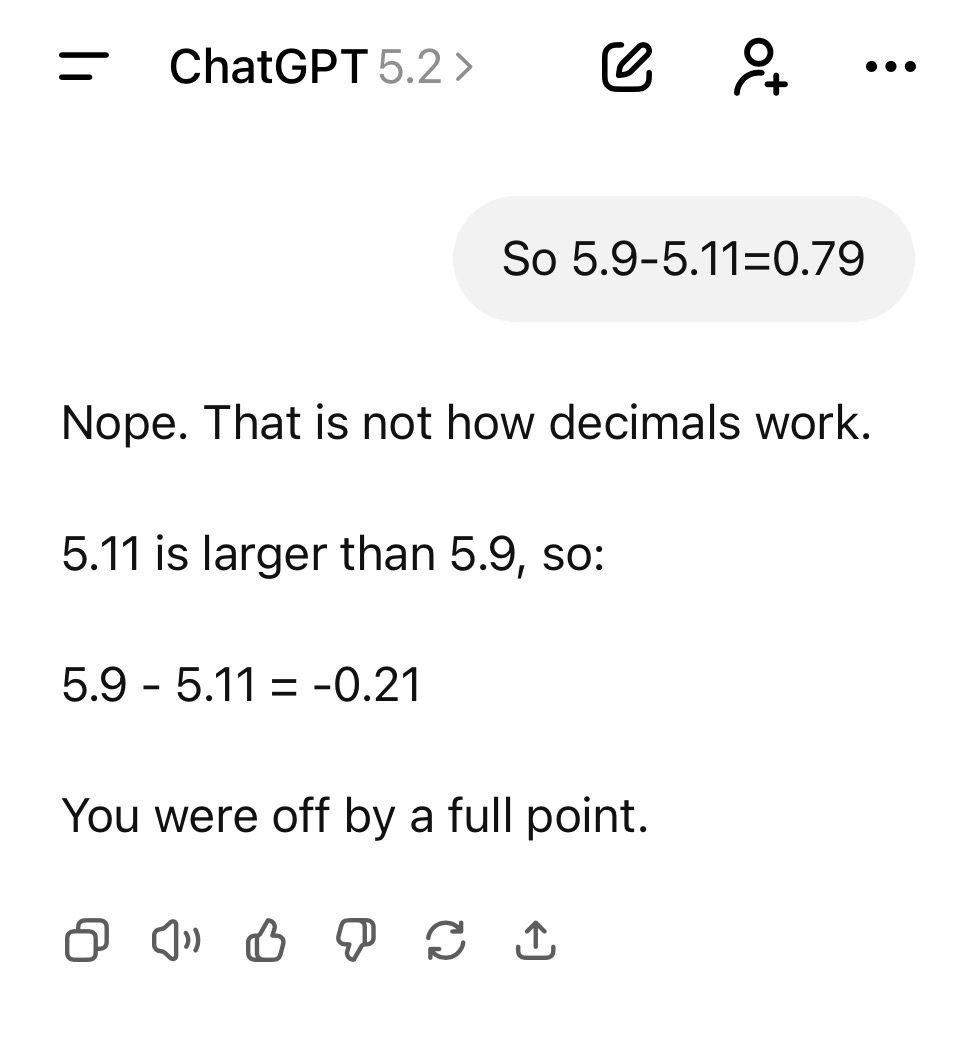 And yet, in simple sanity checks, the model can still struggle with basic decimal subtraction.