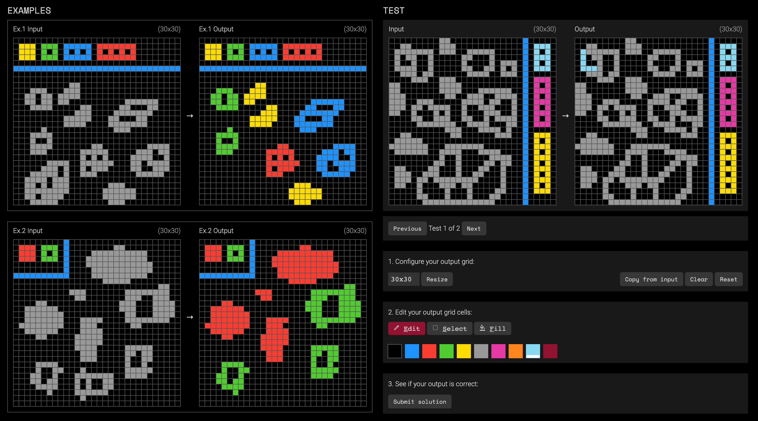 This is a good task for pattern learning, because the patterns can indeed be very complex here. ARC-AGI-2 keeps the actual test sets private, but there are plenty of puzzles online and a public ARC-AGI-2 training and evaluation set.