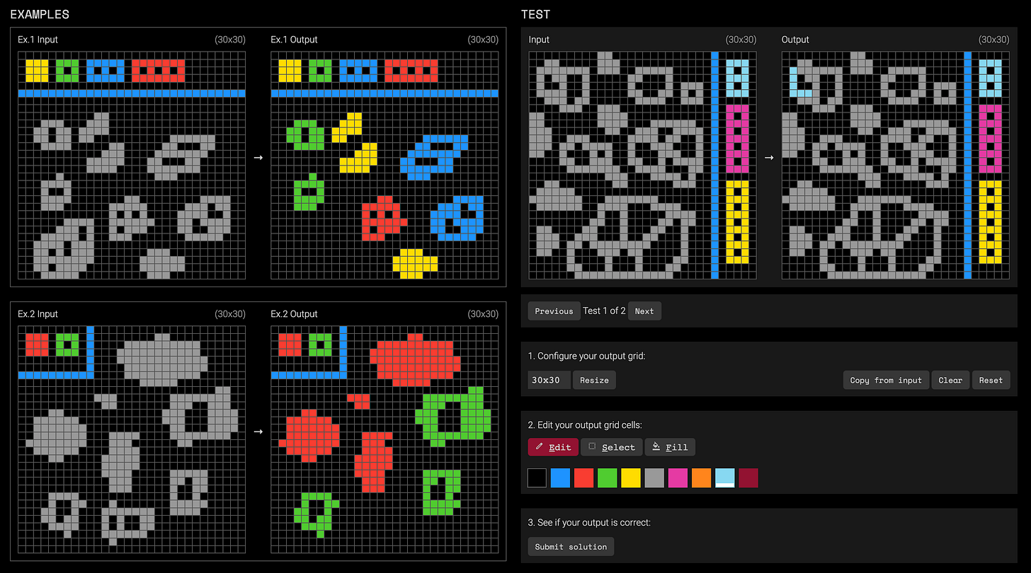 The benchmark presents a series of puzzles. On the right, you see examples of input and output, and on the left you see the test you need to solve. For example, here you need to colour the shapes based on the number of enclosed empty cells within them.