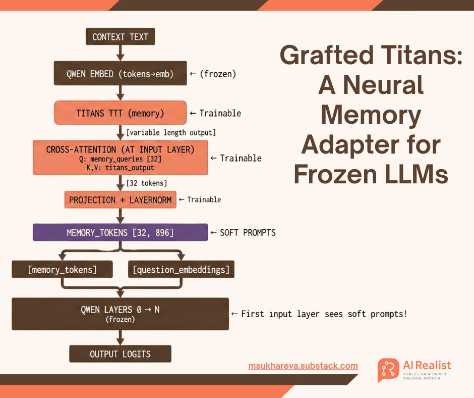 By “grafting” a dynamic Neural Memory module onto a frozen, open-source model (Qwen-2.5) via a lightweight cross-attention adapter, I have created a system that can instantly memorize and retrieve new information with 44.7% accuracy on complex tasks, a massive improvement over baseline, while running on a single consumer-grade GPU (€4.4k hardware). This approach effectively democratizes Google’s cutting-edge “Titans” research, transforming it from a multi-million dollar industrial ambition into a plug-and-play solution that any business can use to build adaptable, personalized AI that “remember” their users, bypassing the noisy bottlenecks of RAG and the immense compute costs of infinite context windows.