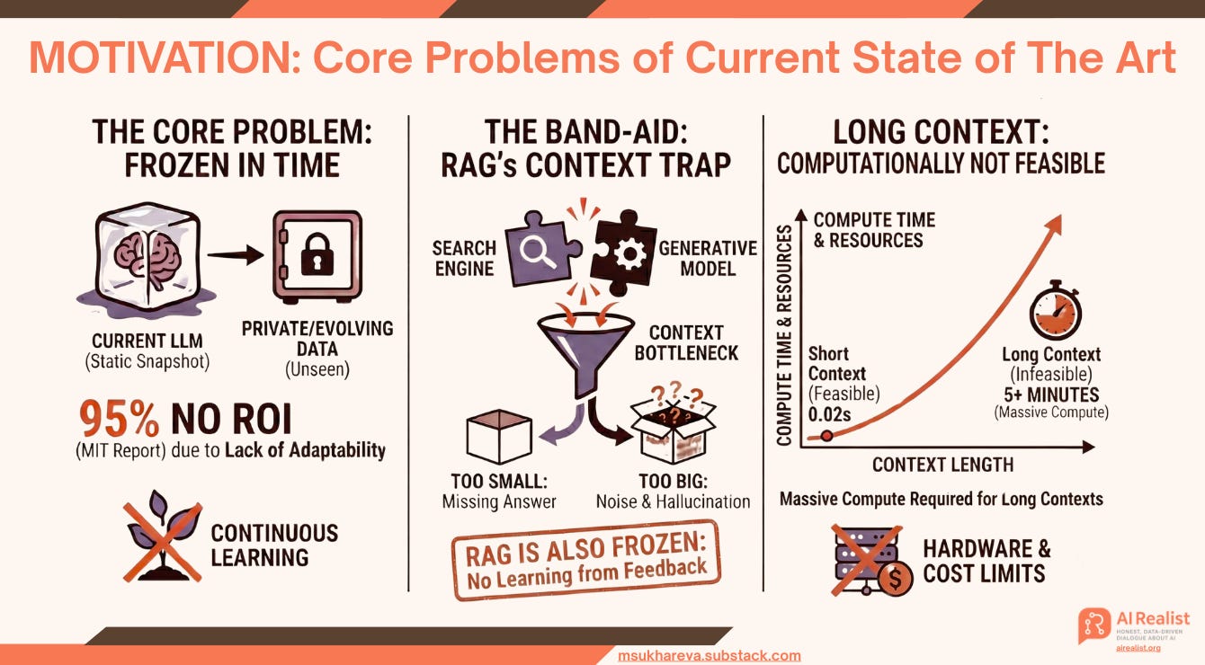 The fatal flaw of current large language models (LLMs) is that they do not learn continuously. They are typically trained on a massive snapshot of data and then frozen in time. When a user interacts with a model, it cannot adapt its weights to new information, nor can it remember corrections from previous sessions. While this static nature is acceptable for general-purpose queries, it represents a critical failure for domain-specific tasks, particularly when processing private, evolving company data that the model has never encountered. An MIT report names this lack of adaptability as one of the major reasons why 95% of AI projects fail to pay off.