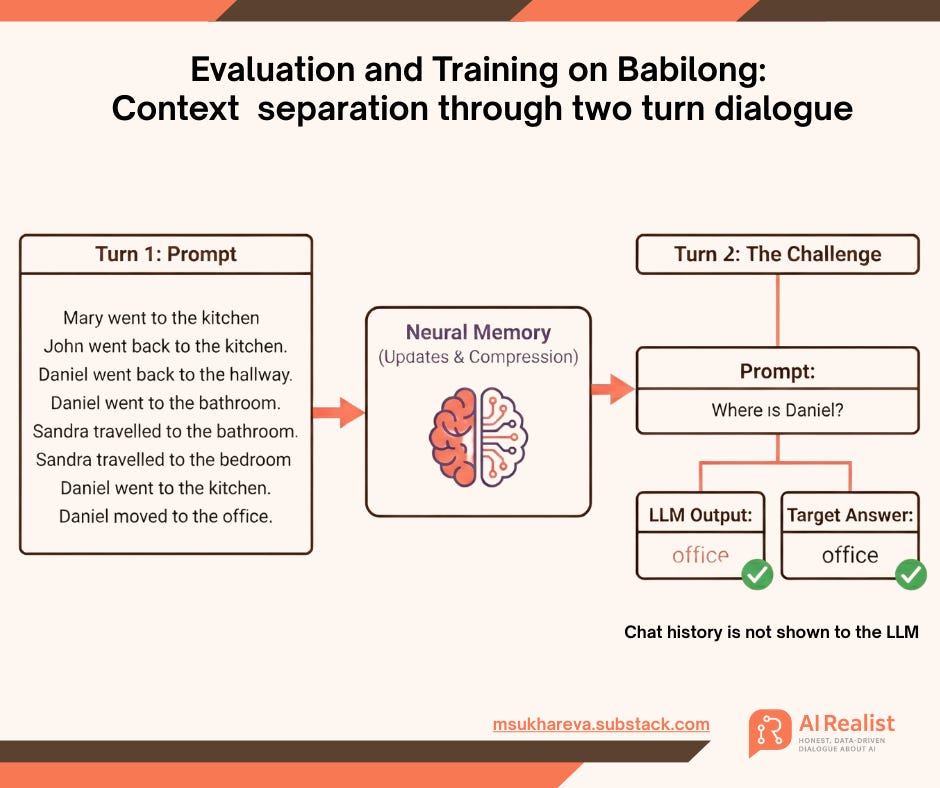 Realistic Multi-Turn Training: Unlike the Google research, I implement a realistic multi-turn setup. The context is provided in the first turn (memorization phase), and the answer is queried in the second turn (retrieval phase). This forces the model to strictly differentiate between the immediate prompt context and the compressed neural memory context.