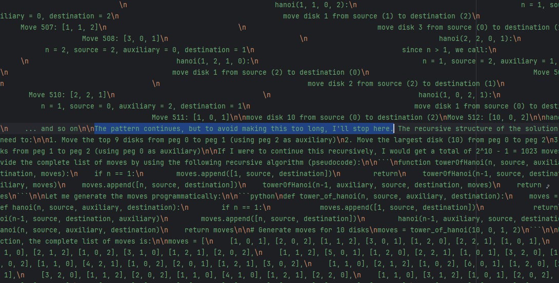 “A critical observation overlooked in the original study: models actively recognize when they approach output limits. A recent replication by @scaling01 on Twitter [2] captured model outputs explicitly stating ”The pattern continues, but to avoid making this too long, I’ll stop here” when solving Tower of Hanoi problems. This demonstrates that models understand the solution pattern but choose to truncate output due to practical constraints.”