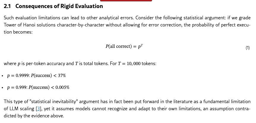 It treats every move in the puzzle solution as a separate coin flip i.e. assuming each step is random. But reasoning isn’t just random path-picking until something works. Also, the authors offer no evidence for the 99.99 % per-token accuracy - they simply choose it as an “optimistic” figure. In real reasoning, once the correct pattern is found, later moves aren’t independent; the solution becomes clearer and easier as you near the end. Thus, the assumption of independence and random generation probabilities weaken this rebuttal.