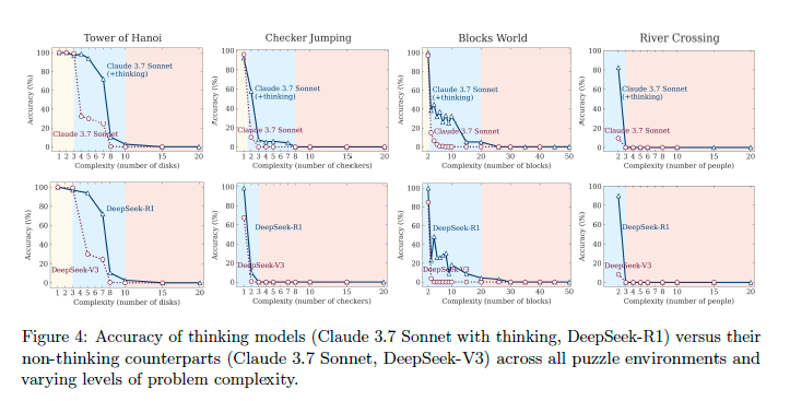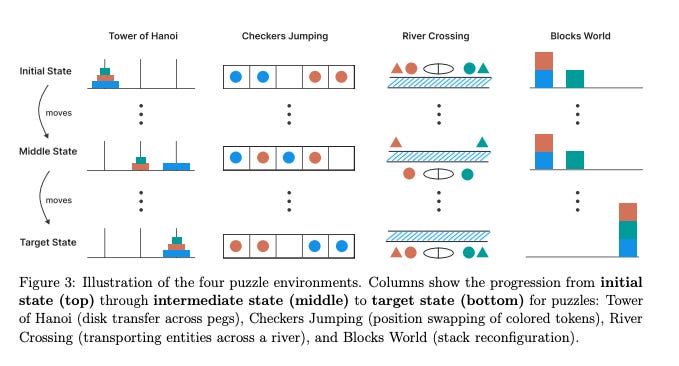 They chose four tasks to test, as shown above. The complexity is increased in a straightforward way—by adding more disks to the Tower of Hanoi, more checkers, more objects for River Crossing, and more blocks.