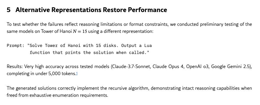 It just tells the model, “Write a program that calculates the answer,” which is not what the authors set out to test. Calling an external tool (or emitting canned code) doesn’t show reasoning; the whole goal was to see whether the model could reason its way through the moves and, in principle, decide which tool to invoke on its own. Generating code here is almost certainly memorisation, the code solutions are likely to be found online (at least it cannot be excluded), so the Lua trick doesn’t address the paper’s real question.