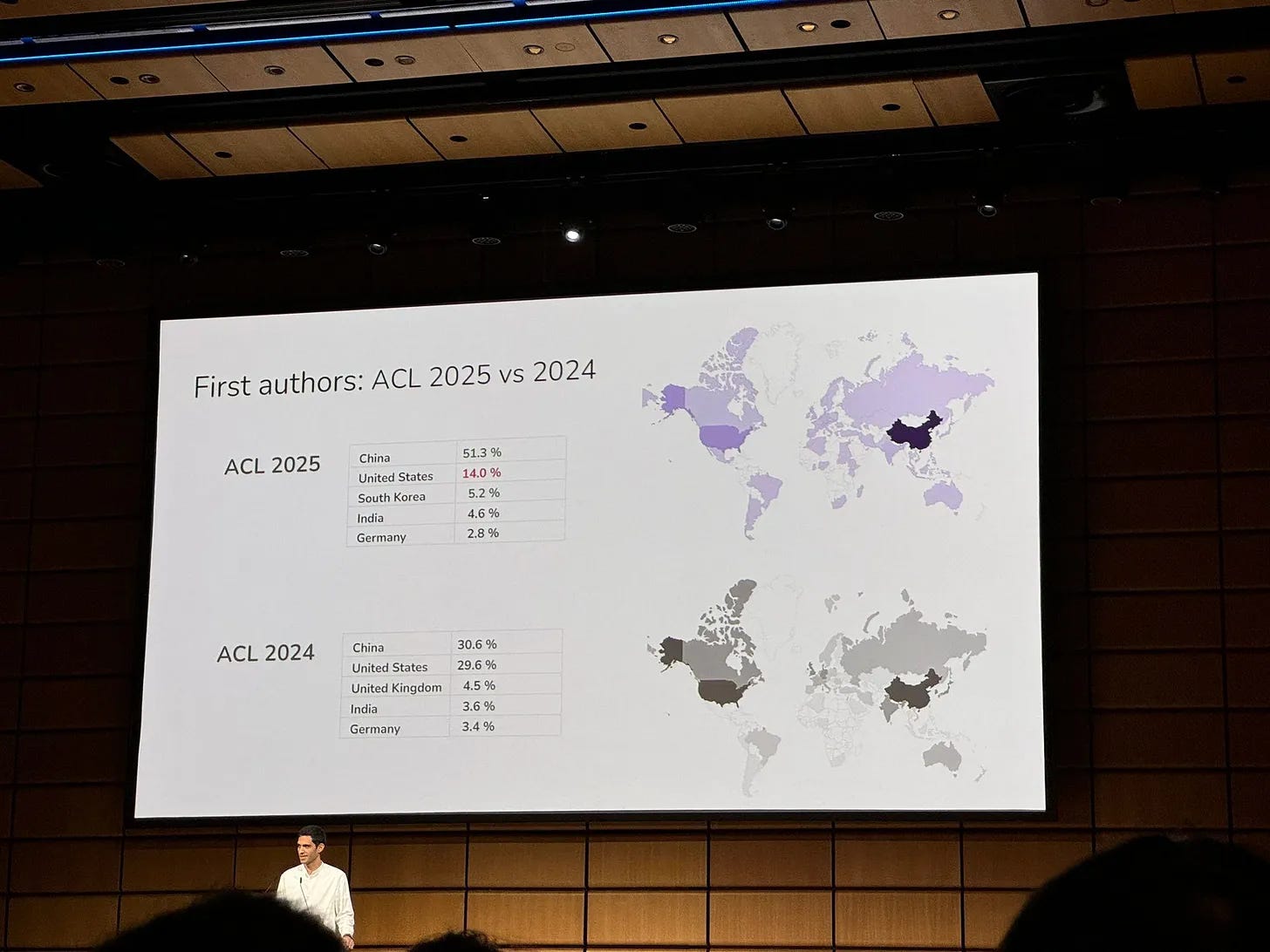The US finds it increasingly harder to keep up with the pace and speed of innovation. At ICLR, one of AI's three most prestigious conferences, Chinese papers were outnumbered 5-to-1 by American papers in 2021 — by 2025 they are almost equally numerous. At NeurIPS 2025, China and the US were neck-and-neck in paper counts, at ACL-2025 Chinese papers significantly outnumbered the US papers -a dramatic reversal from just a year before.