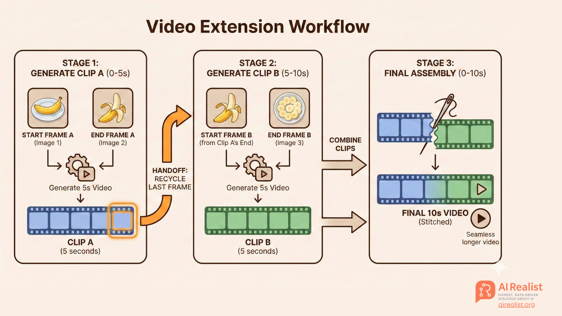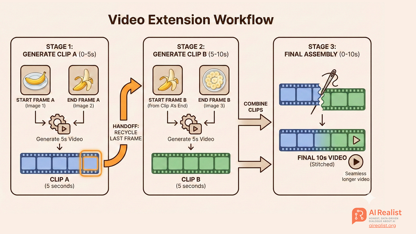 The Workaround: The “Handshake Method” Since we can’t generate a long video at once, we treat the video like a relay race. We use a technique called the Handshake Method (or Video Extension Workflow). We generate short 5-to-10-second clips and stitch them together, strictly using the last frame of the previous clip to anchor the start of the next one.