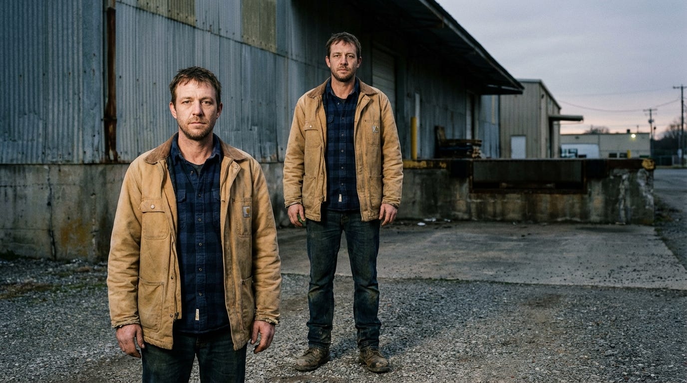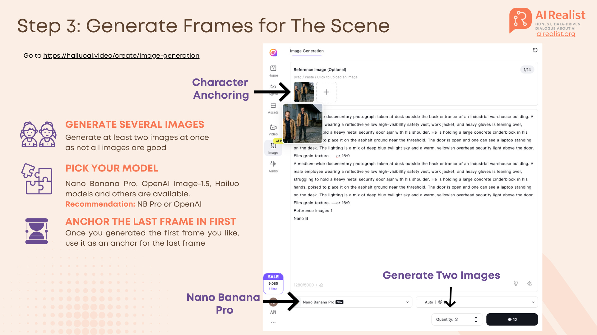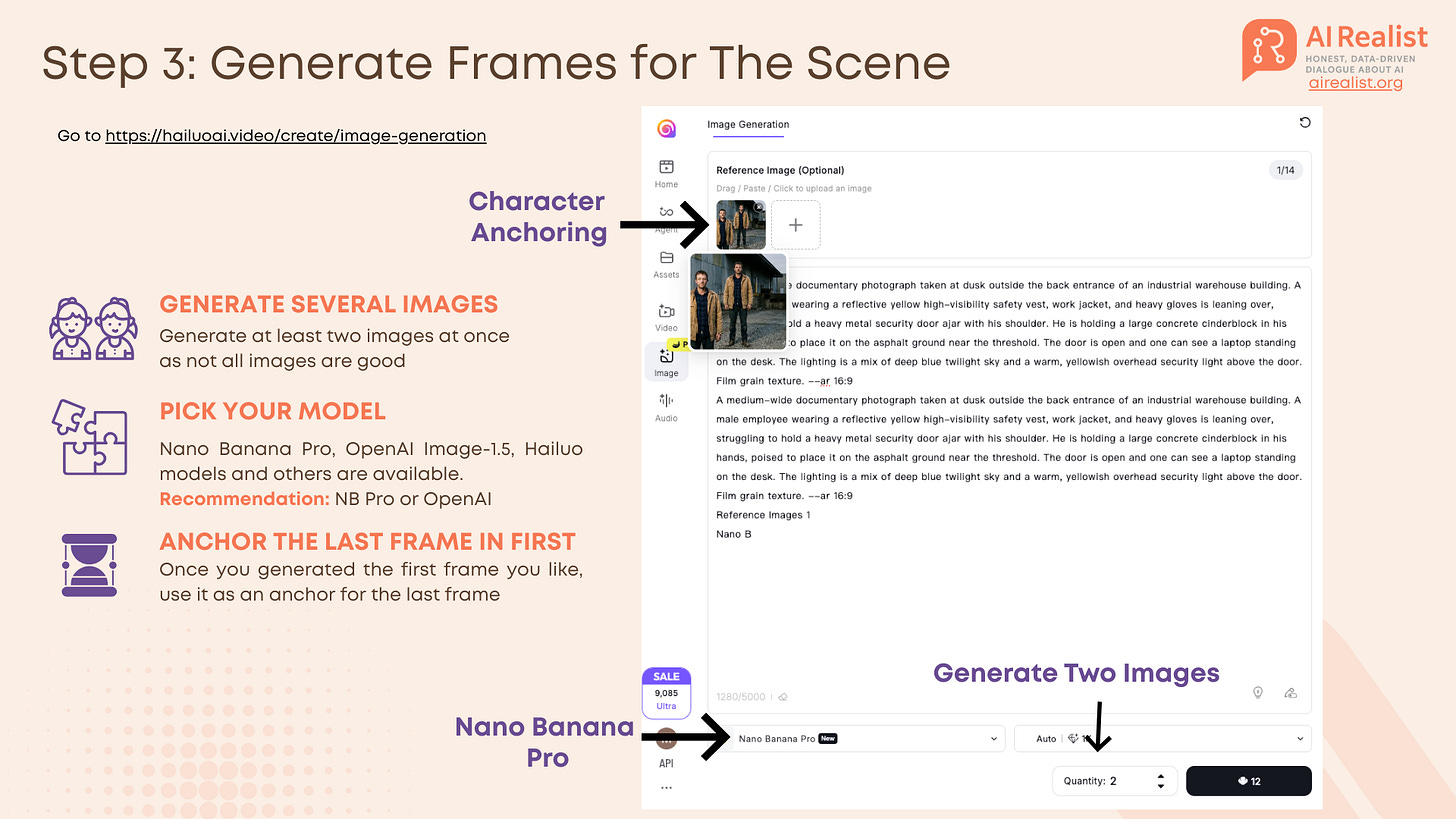 A documentary-style full-body photograph of Mark, a warehouse employee in his late 30s with a slightly tired expression, short brown hair, and stubble. He is wearing a worn tan canvas utility jacket over a navy blue flannel shirt, durable dark denim jeans, and scuffed leather work boots. He stands squarely facing the camera outside a large corrugated metal and concrete industrial building during twilight. The natural dusk lighting is diffuse, clearly illuminating his face and clothing details. The background includes gravel pavement and the corner of a loading dock. Film grain texture. 16:9I usually add the size of the image to be generated at the end of the prompts (16:9). HailuoAI has an option to specify it, but I tend to forget. I typically set it in the UI as well, but including it in the prompt acts as a safety backup. For all images, I usually generate two variants. However, if there is something complex to generate, I create more variants, as it is likely that many of the images will not turn out well.Use a model like Nano Banana Pro or OpenAI Image-1.5 for this initial image. Once you have a “Mark” you like, this image becomes the DNA for the rest of your video.