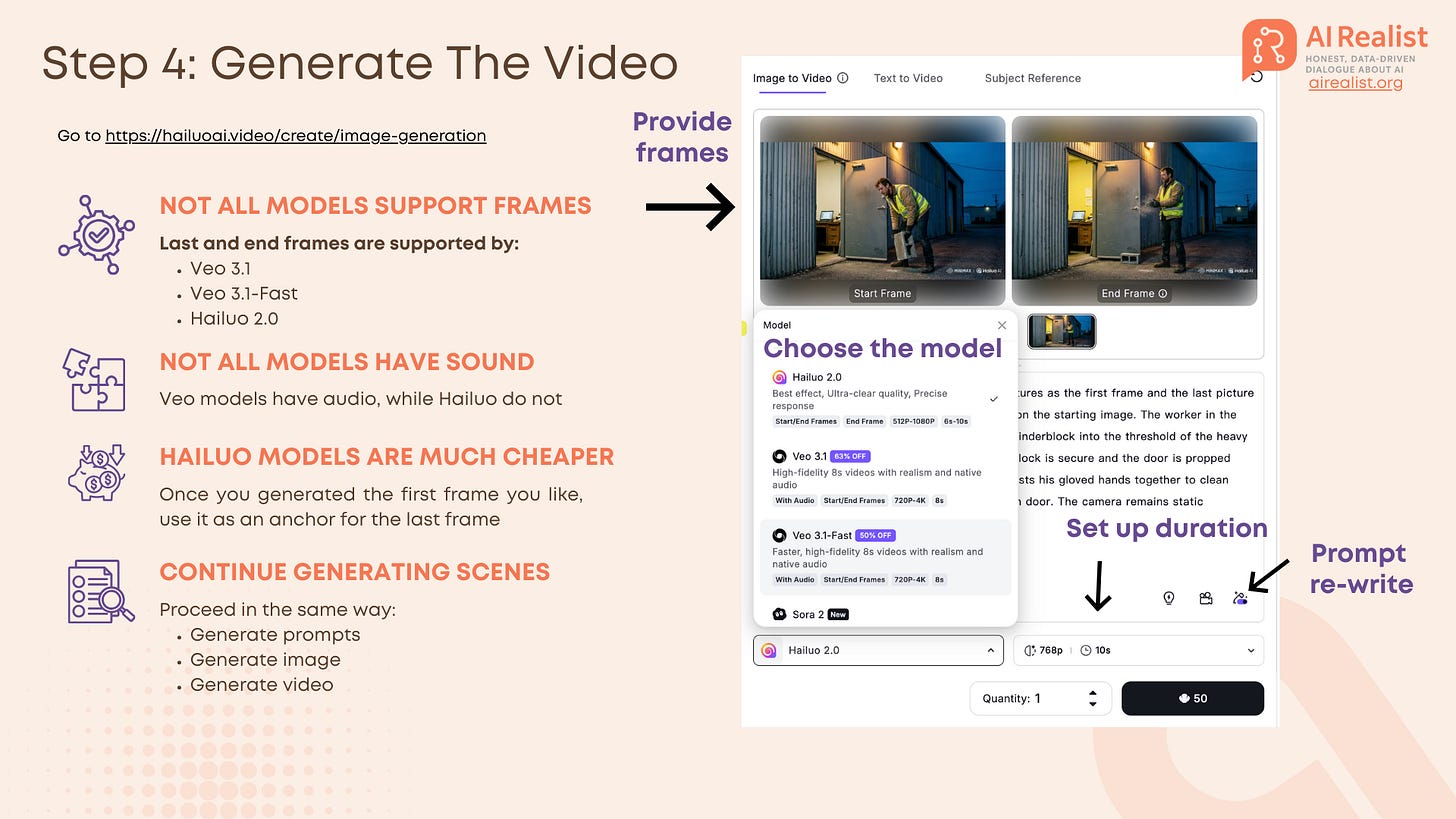 Sora 2 (OpenAI): Available in the list, but currently does not support the End frame workflow effectively for this specific “handshake” technique. It only supports the first frame. Of course, you could do a work around and start generating the next video with the last automatically generated frame of the previous video, but this gives us less control and Veo 3.1 is comparable in quality.